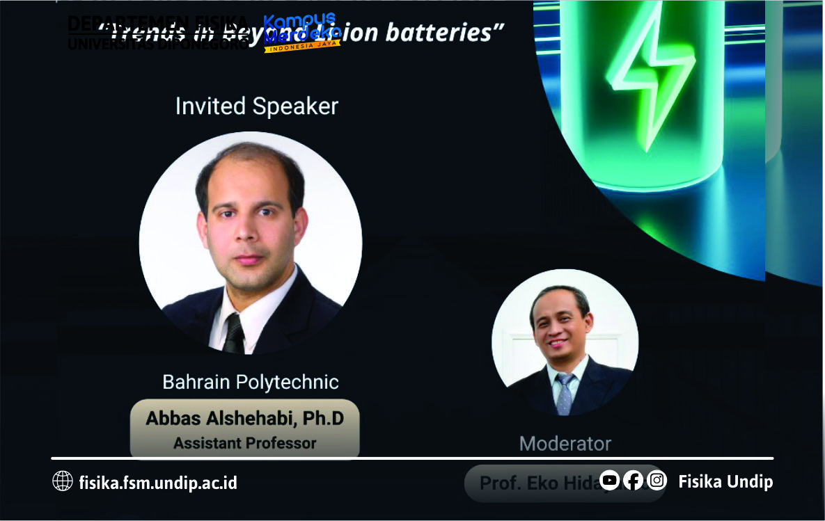 The lecture, titled “Trends in Beyond Li-ion Batteries,” will be delivered by Dr. Abbas Alshehabi, an Assistant Professor specializing in battery technology and energy materials from Bahrain Polytechnic. Prof. Eko Hidayanto from Diponegoro University will act as the moderator for the discussion.