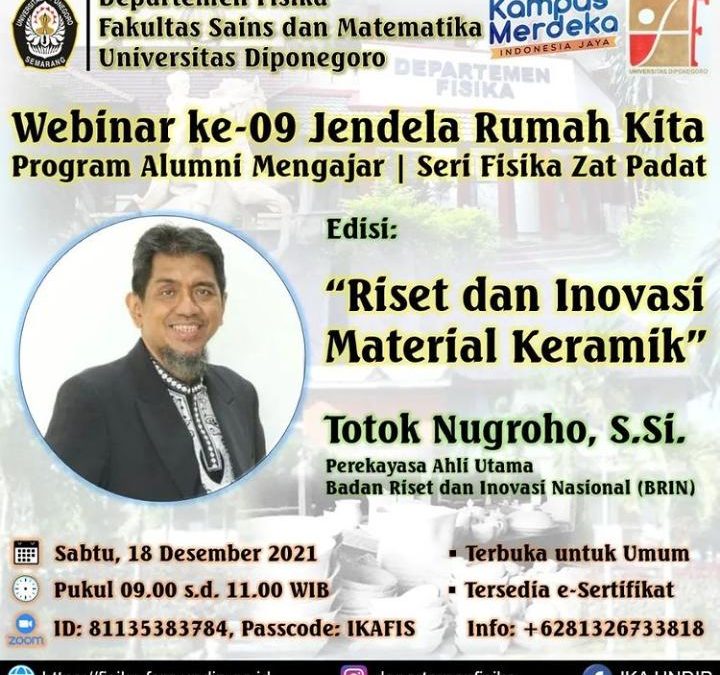 Jendela Rumah Kita is an ongoing event organized by Physics Department, Diponegoro University and is a Teaching Physics Alumni program in facilitating physics students in particular to gain knowledge through the stories of great speakers from alumni and other great figures. Jendela Rumah Kita series 9 discusses the Research and Innovation of Ceramic Materials with Mr. Totok Nugroho, S.Si.