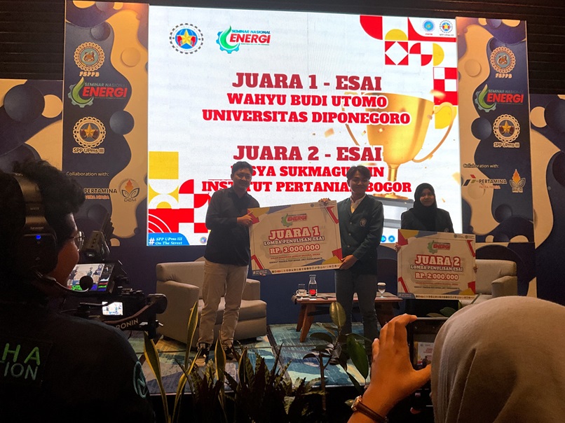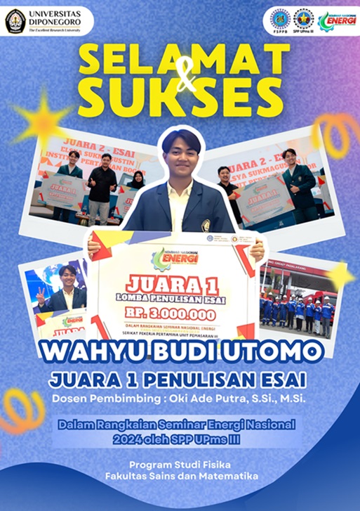 Wahyu Budi Utomo, a Physics student from Diponegoro University, guided by lecturer Oki Ade Putra, S.Si., M.Si., won 1st place in the essay category at the 2024 National Energy Seminar. The event, held from November 1-3, 2024, at Oakwood Merdeka Hotel in Bandung, was organized by the Pertamina Workers Union Unit 3 Marketing in collaboration with Pertamina Patra Niaga and the Serang Student Energy Council (DEM). The seminar brought together participants from various universities across Indonesia.