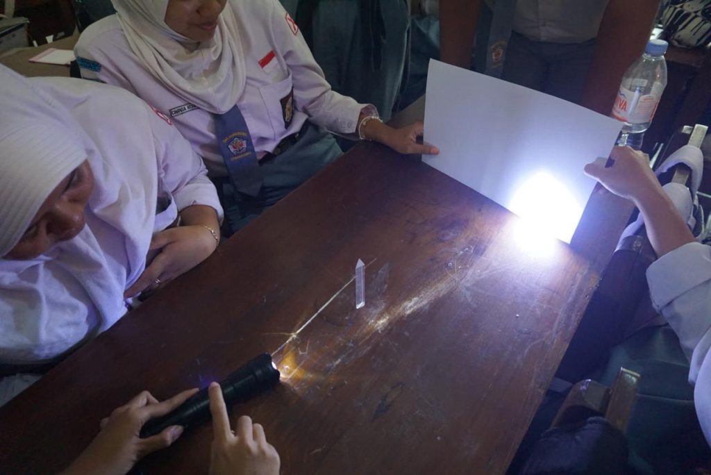 Pemahaman tersebut diperkuat melalui eksperimen sederhana dengan menggunakan akuarium berisi air, keping CD, serta prisma. Melalui percobaan ini, siswa dapat secara langsung mengamati bagaimana cahaya putih terurai menjadi spektrum warna, layaknya pelangi.