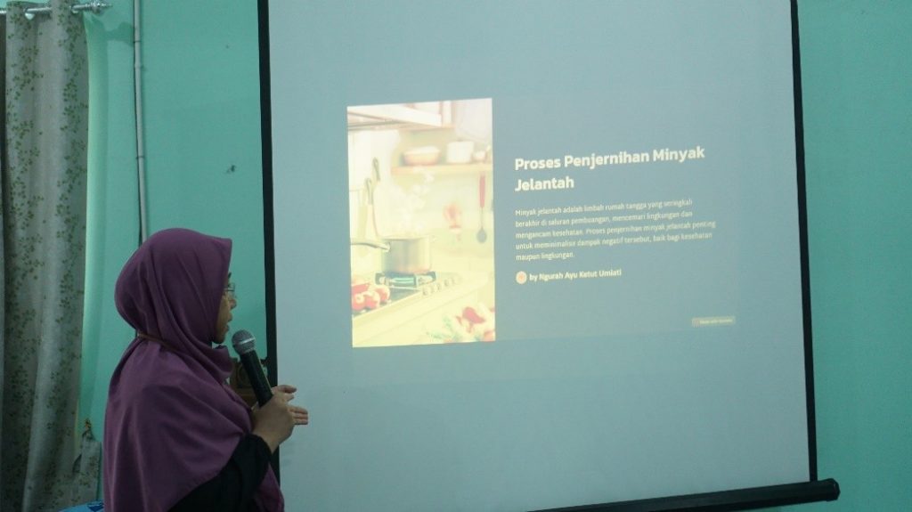 Pelatihan diawali dengan paparan dampak limbah minyak jelantah terhadap kesehatan dan lingkungan, disusul demonstrasi teknik pengolahan. Peserta diperkenalkan langkah-langkah mulai dari penyaringan minyak, pencampuran bahan pewangi, pemanasan, hingga pencetakan lilin. Semua proses menggunakan peralatan sederhana yang mudah diterapkan di rumah. Antusiasme peserta terlihat saat sesi praktik, dengan banyak ibu-ibu aktif mencoba membuat lilin aromaterapi mereka sendiri.